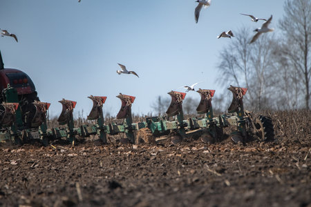 Tractor plowing a field with flying birds in the background, showcasing agricultural activity and the beauty of rural landscapes in a sunny environment