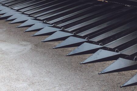 Black metal figured cutters and harrows of a multi-row cultivator against the background of stubble of cut wheat.