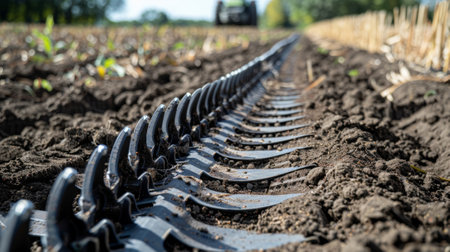A sleek blue modern implement actively tills prepared soil, showcasing advanced farming technology in a sunlit field set for upcoming crops.
