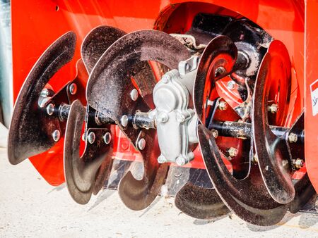 Agriculture equipment concept. Detailed closeup of disc harrow, agricultural machinery. Outdoor shot