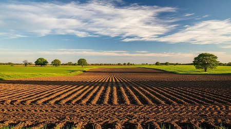 Farmland with neatly plowed rows stretching towards horizon, clear blue sky setting, highlighting vast expanse of agricultural potential, concept of farming, crop production, rural landscape.