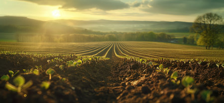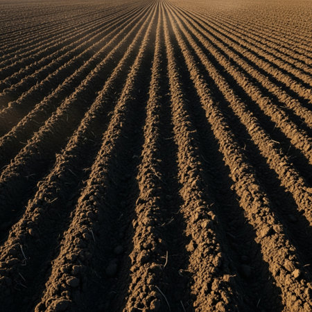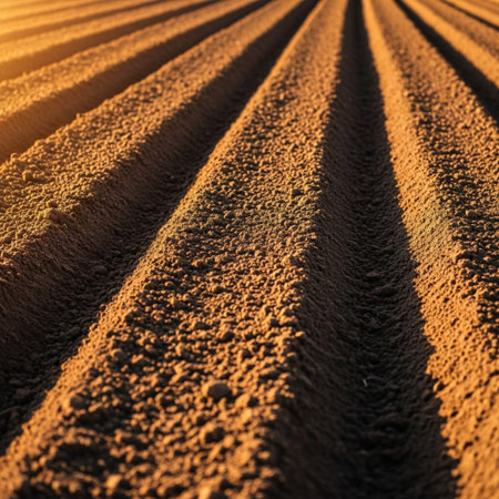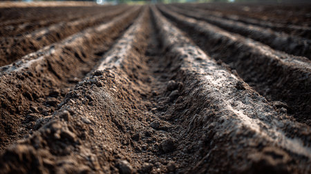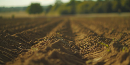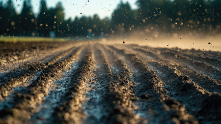 This image captures the intricate details of freshly plowed soil, showcasing the dirt particles illuminated by sunlight, reflecting the essence of agriculture.