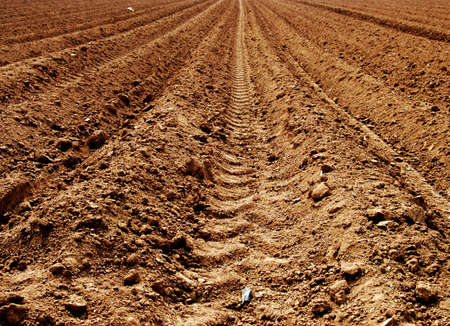 Tractor-made furrows stretch into the distance in a cultivated field.