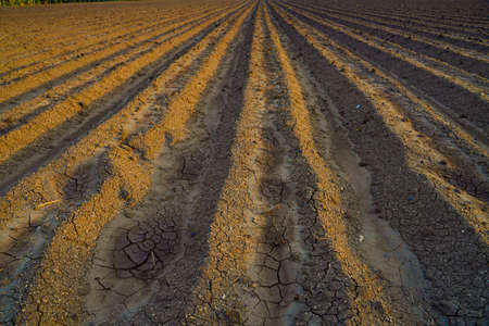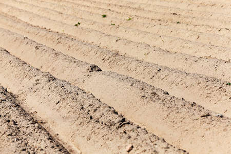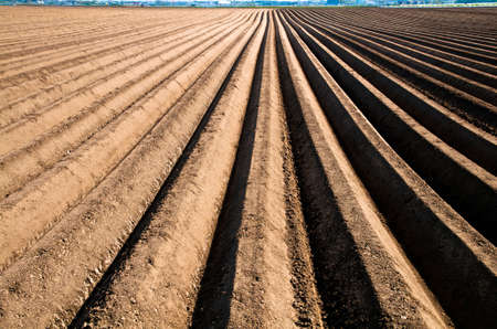 Furrows rows pattern in a plowed field prepared for planting potatoes crops in spring.