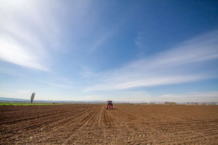 tractor working large plowed field on hill with harrow under blue sky in dutch province of south limburg in the netherlands