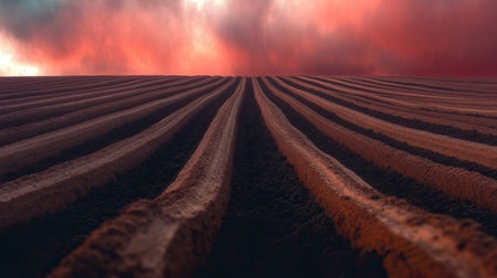 Wide-angle cinematic view of rich, dark, freshly tilled soil under harsh sunlight, ready for plantin