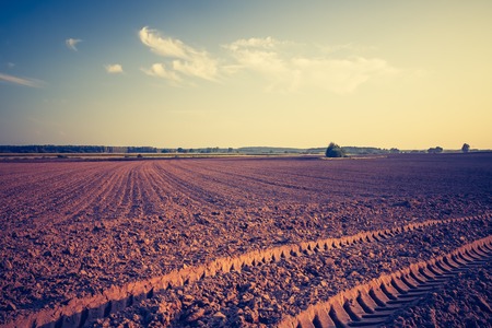 Vintage photo of rural landscape with plowed field on foreground. Polish countryside