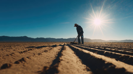 A dedicated farmer works diligently on the soil under a bright sun, showcasing the beauty of agricultural labor in a serene landscape. The scene highlights the connection to nature.