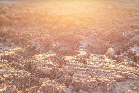 Heap of dry soil and rough mud in construction site. Shoot in sunset time with sunlight and lens flare effect