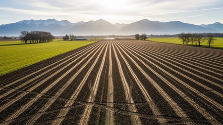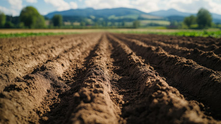 Generative AI : Furrows a plowed field prepared for planting crops in spring Horizontal panoramic view landscape with clouds on blue sky in perspective Agriculture sowing seeds and