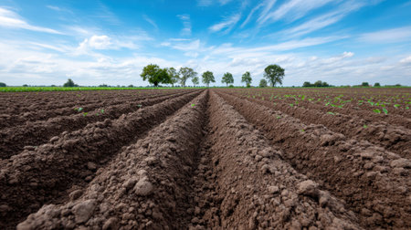 This image captures the beauty of freshly tilled soil with evenly spaced furrows in a serene rural landscape, showcasing the essence of agricultural preparation.