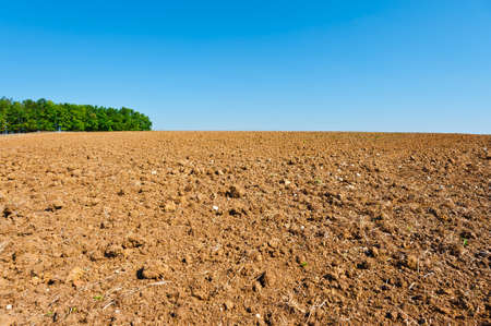 Agricultural field with trees on the horizon line. Blue sky over the field. The soil is plowed with agricultural machinery
