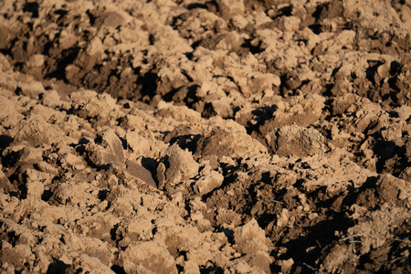 Ploughed field, soil close up, agricultural background