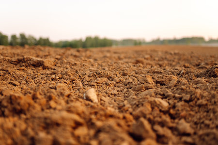 Close-up of freshly tilled soil, with empty space in the surrounding area for copy or branding