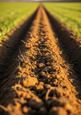 This image captures the intricate details of freshly plowed soil, showcasing the dirt particles illuminated by sunlight, reflecting the essence of agriculture.