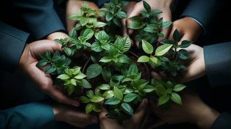 Business hands holding green plants together are the symbol of green business company. agriculture and collaboration in a green business.