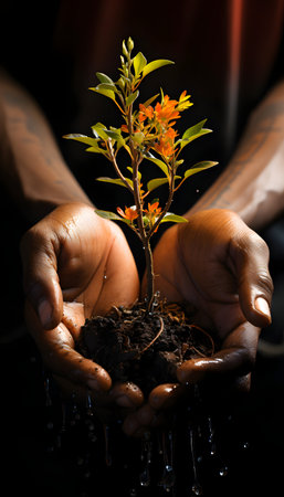 A close-up image of hands gently holding a small green plant with rich soil, embodying themes of care, growth, and a strong connection to nature and sustainability.