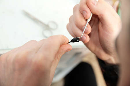 Close up of a hands working with precision on reflective surface. Photo with a subtle grain, soft focus blur