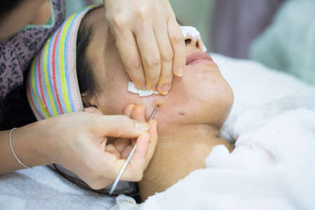 Beauty treatment of face skin for spot remover in SPA center. Acne treament.