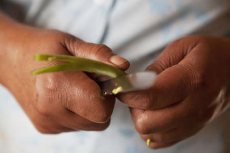Close up of hands of a retired man holding a hook of the rob while fixing it