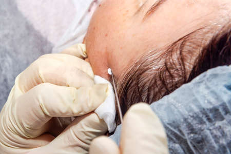Dermatologist surgeon inserts polylactic acid filaments to perform facial lifting - Selective focus