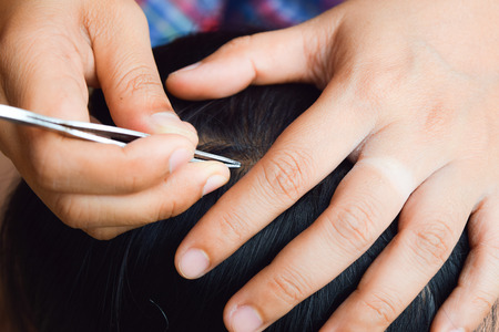 Hand of a doctor in a medical glove holding a hair follicle with tweezers. Hair transplantation and restoration concept, FUE method in cosmetology aesthetic surgery.