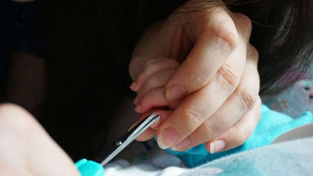 A newborn childs nails are cut with special baby scissors. An adult hand holds a small childs hand. Carefully, the mother cuts her daughters nails. A child in a cocoon, home environment. Trust.