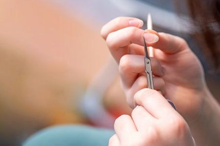woman's fingers using small scissors to trim cuticles, showcasing a nail care routine for beauty and elegance