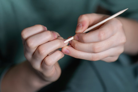 female hands carefully removing cuticles using an orange wood stick, showing a detailed manicure process in a serene beauty setting