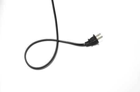 Black flat electrical plug with wire isolated on white background without nothing. The appliance is off. Electricity safety precautions. Close-up.