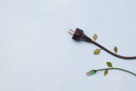 electric plug with green leaves on a blue background, top view okpia place, energy conservation concept