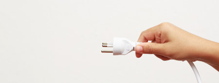 Male hand holding plug cable with copy space. Electrical equipment, electrical wires in the house. The correct use of electricity concept.