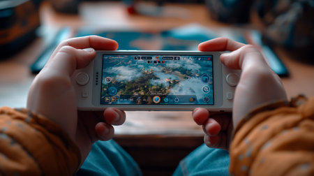 Entertainment, home electronics, gaming concept: a teenager hands holding wireless controller gamepad playing console video game