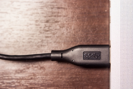 Male hand plugging white USB-C Type C cable into a port on a grey laptop notebook computer. USB type-C port and Cables White of laptop.