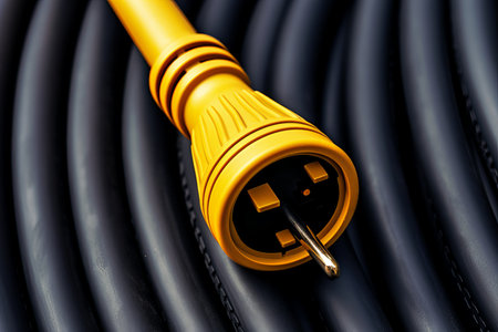 A bright yellow electric plug stands out against thickly coiled black cables in a dimly lit workshop. The focus highlights the intricate design of the plug and cable arrangement.