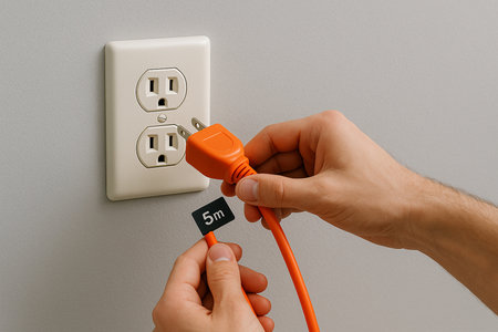A striking image of an illuminated electrical socket with a plugged cord, set against a warm wooden surface, embodying modern technology and stylish home interiors.