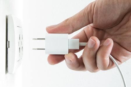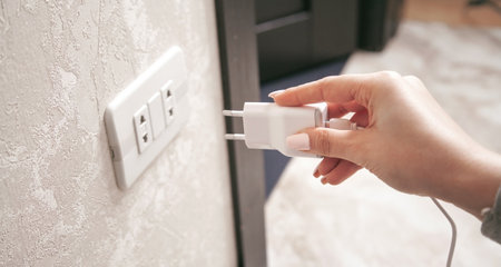 Close-up of a womans hand inserting a white usb charger into a 220 volt socket