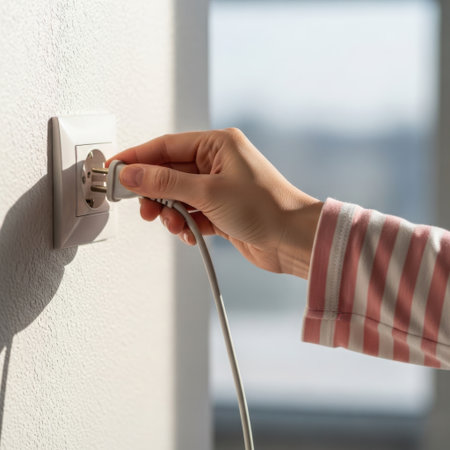A person's hand is shown plugging a white charger adapter into a European-style electrical wall socket. The action represents connecting to power, charging a device, and the consumption of energy in a modern home.