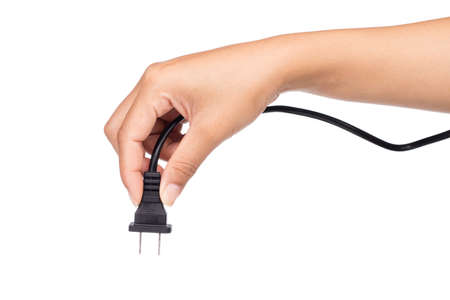 isolated white background hand holding electric plug