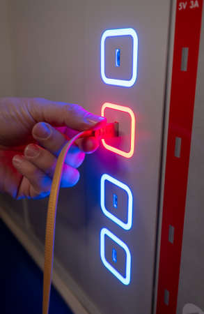 Male hand plug USB cable to the free charging port in modern subway train