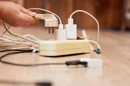 Hand holding Electric plug put on multiple socket. Electrical equipment, electrical wires and power strips in the house. Earth Hour saving electrical energy.