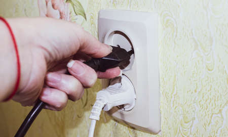 Closeup finger unplugging or plugging of electricity device at home. Energy Saving, power, electrical and lifestyle concepts