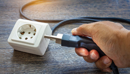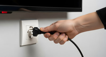 A person's hand is shown unplugging a black electrical power cord from a white European-style wall socket. The action represents disconnecting a device, saving energy, electricity conservation, and electrical safety.