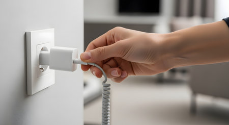 A person stands at a modern interior wall, connecting a smartphone to an electrical outlet. This relatable scene captures technology integration in daily life.