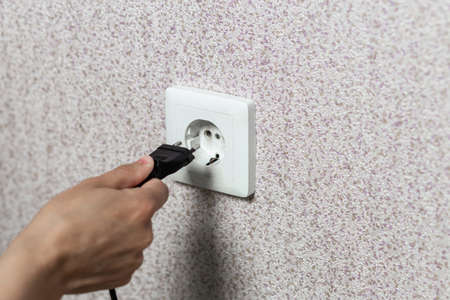 Disconnecting black electrical power plug with a hand inside a white plastic power socket on a white wall