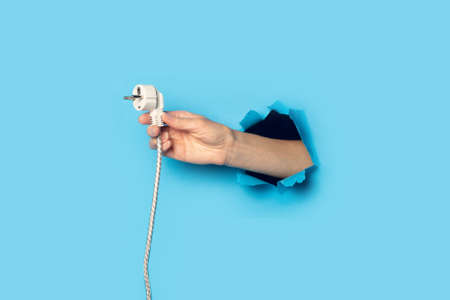 Female hand holding a plug with a wire on a bright blue background.