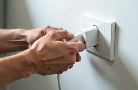 A surrealistic image of human hands unplugging from a white electrical outlet, creating a visual metaphor.. AI Generation
