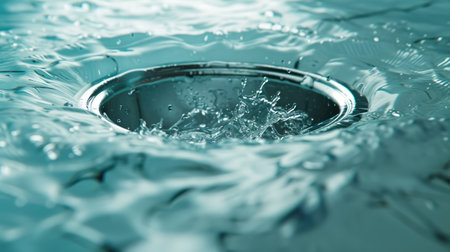 Water flowing into a stainless steel sink drain with dark reflections and ripples Clear details and vibrant co...