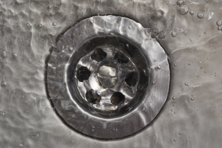 Stainless steel sink plug hole close up with water