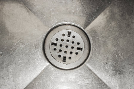 Stainless steel sink plug hole close up background.